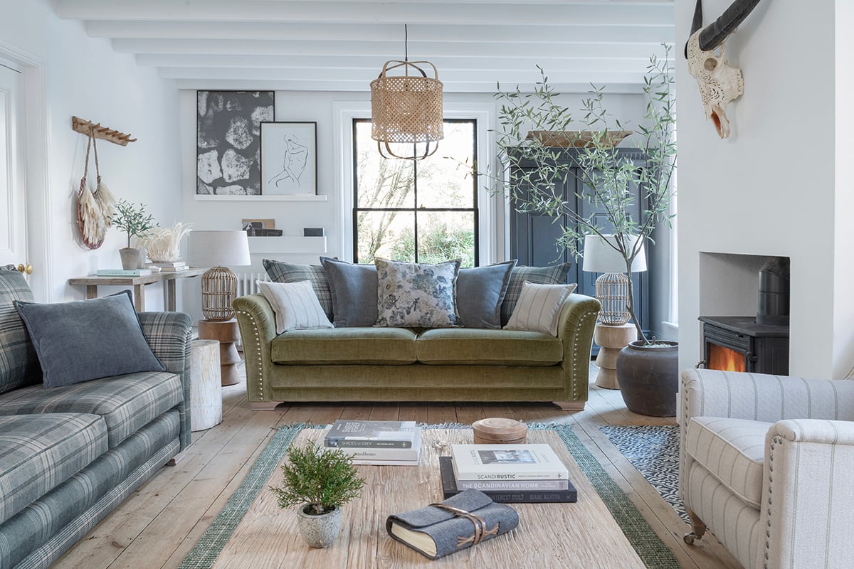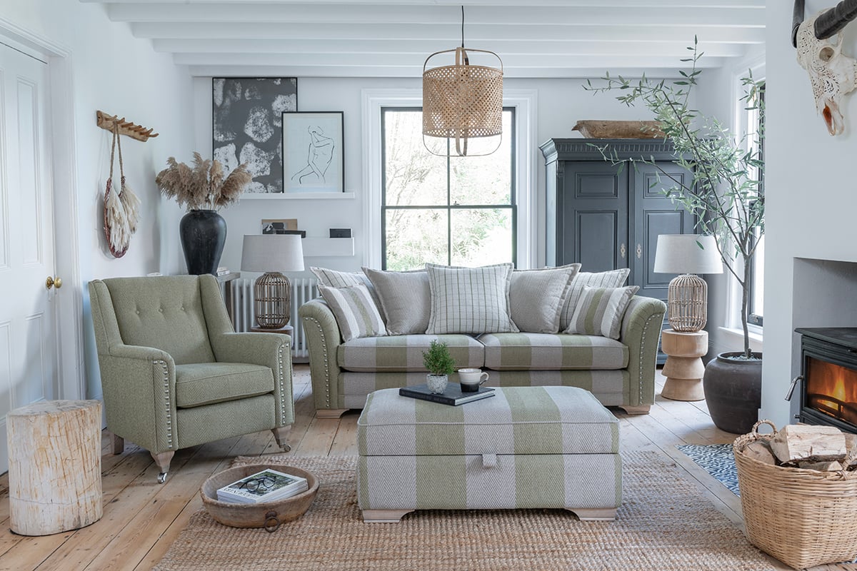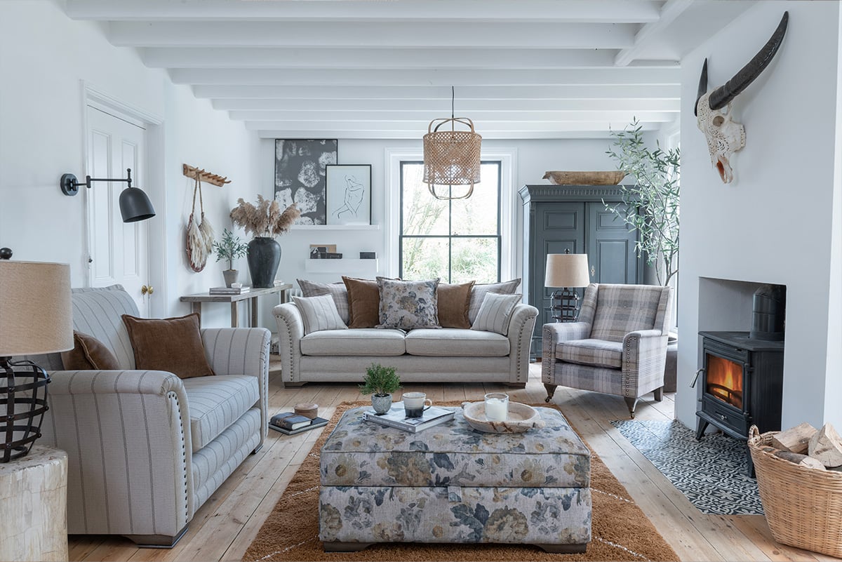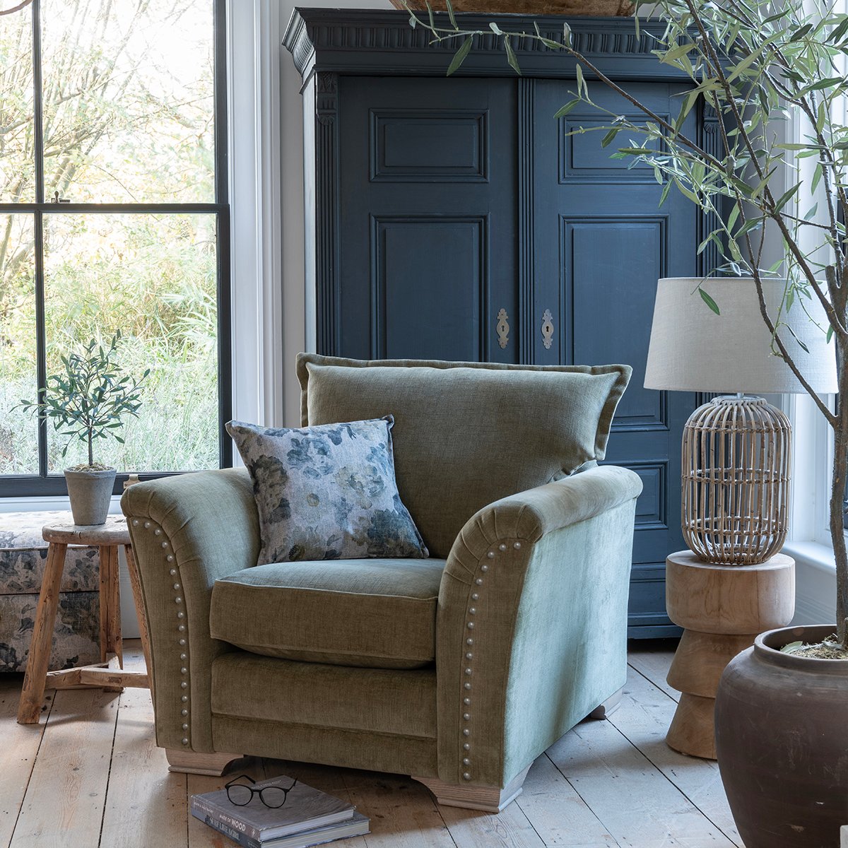 Evesham has the best of both worlds – casual with beautiful pillow back fabrics, a great sofa to curl up on in front of the TV or choose the classic back cushions for more formal elegance when entertaining. The design is subtle, understated, with a perfectly proportioned sabre arm, hand pleated soft styling, finished off with a line of antique studs, each individually hand tacked in place. Of course, the studs are optional, sofas can also be supplied without if preferred. Crafted with meticulous attention to detail, sofas are fitted with solid ash feet, hand finished in Warm Grey or Antique colours to match perfectly with any interior. There’s a choice of beautiful fabrics ranging from vintage floral designs to plaids and stripes with warm earthy shades to create a country inspired aesthetic. The overall look embodies rustic and nostalgic charm, drawing inspiration from the elements of farmhouse or paired back, cottage style interiors with some looks featuring bolder statement colours to contrast against neutral interior schemes. A country inspired collection would not be complete without a wing back chair. The Woodstock Accent Chair has been designed to complement Evesham, a classic piece with a modern twist.