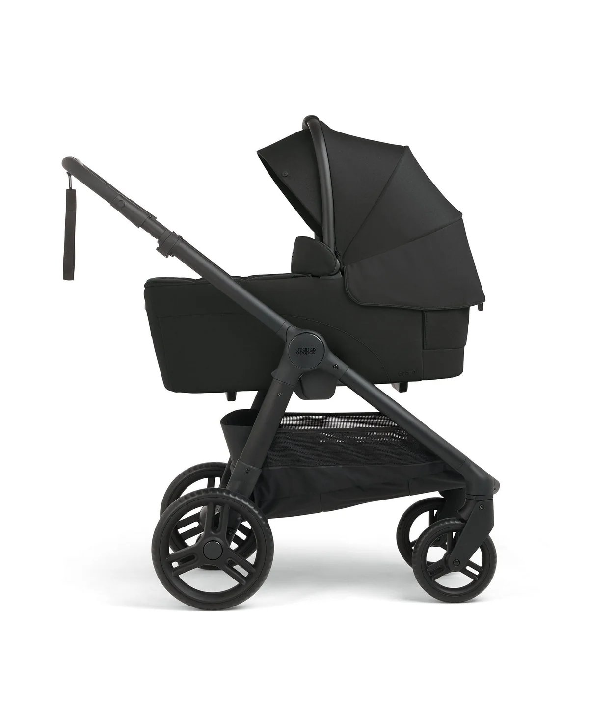 Approved for overnight sleep, this carrycot is designed for use with the Ocarro 2 pushchair and interior carrycot stand* to deliver the ultimate in comfort, convenience and safety. The cushioned, lie-flat mattress supports a natural sleeping position for newborns, perfect for daytime napping and safe overnight rest, whether on the chassis or portable stand. A fold-down, removable apron allows you to settle baby quickly and quietly, while the hood's ventilation panels keep them shaded, cool and comfortable. Updated with premium quilted lining, featuring moisture-wicking and antibacterial properties, it’s as practical as it is plush. Styled to perfectly complement the Ocarro 2 Eclipse, our carrycot showcases the same soft, recycled fabrics in a shadowy black palette and modern matte accents for effortless contemporary style.