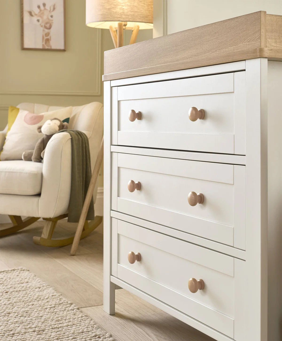 Your baby's nursery will look adorable with our Wedmore nursery furniture collection, which comes in a two-tone white and neutral finish. This line, which was designed and developed in-house at Mamas & Papas, features a multitude of ingenious storage possibilities and is completed with traditional soft rounded edges and Oak effect accents.